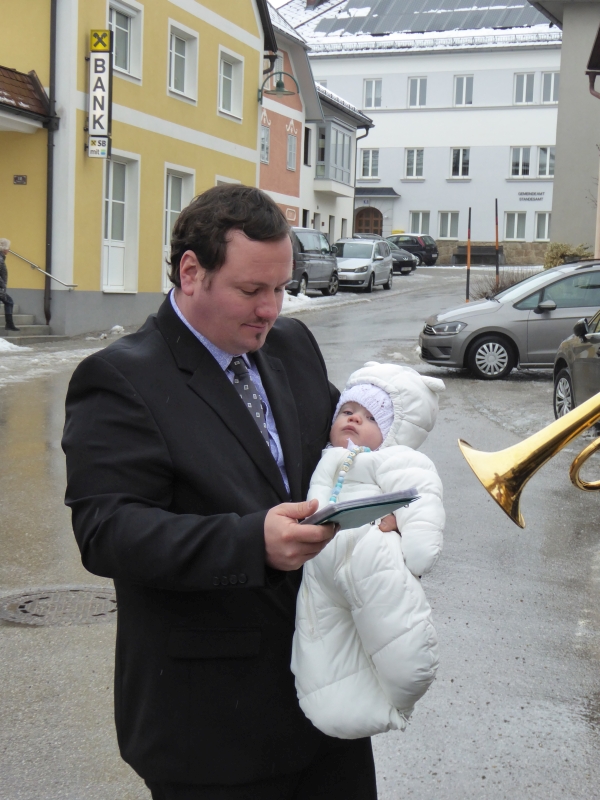 Wie auch schon bei Davids großer Schwester Marie durften wir auch heute wieder die Familie nach der Taufe musikalisch mit ein paar Märschen empfangen. David bekam zur Taufe eine erste Uniform und gehört damit jetzt offiziell zum Fanclub des Musikvereins Pfarrkirchen. 😉