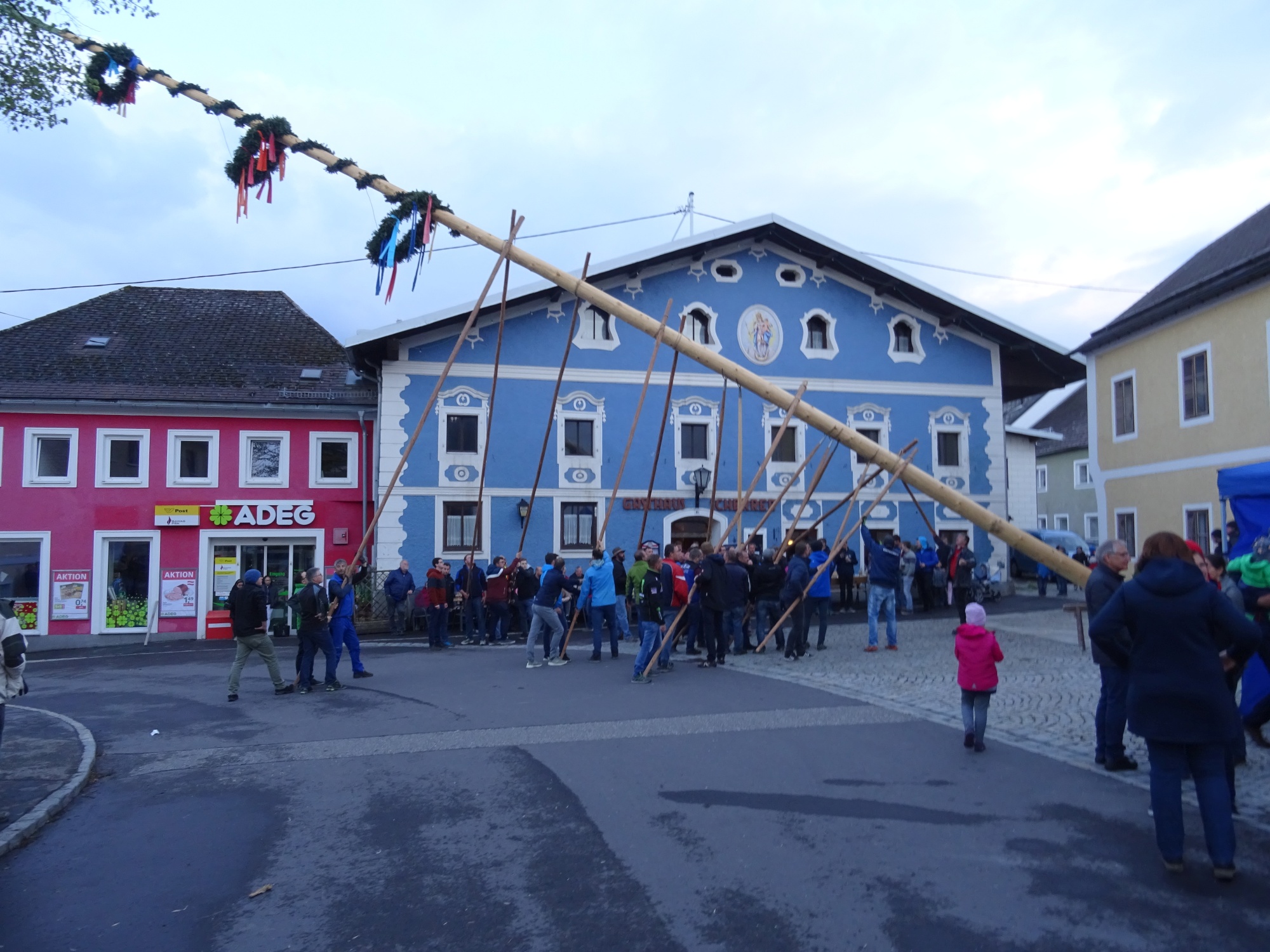 Mit geballter Muskelkraft konnte der Baum, wie jedes Jahr, händisch aufgestellt werden. Erstmals gab es heuer auch eine Verlosung des Maibaums. Die glückliche Gewinnerin Elfriede Scholl erhält den Maibaum Anfang Juni – falls dieser nicht bis dahin gestohlen wird…