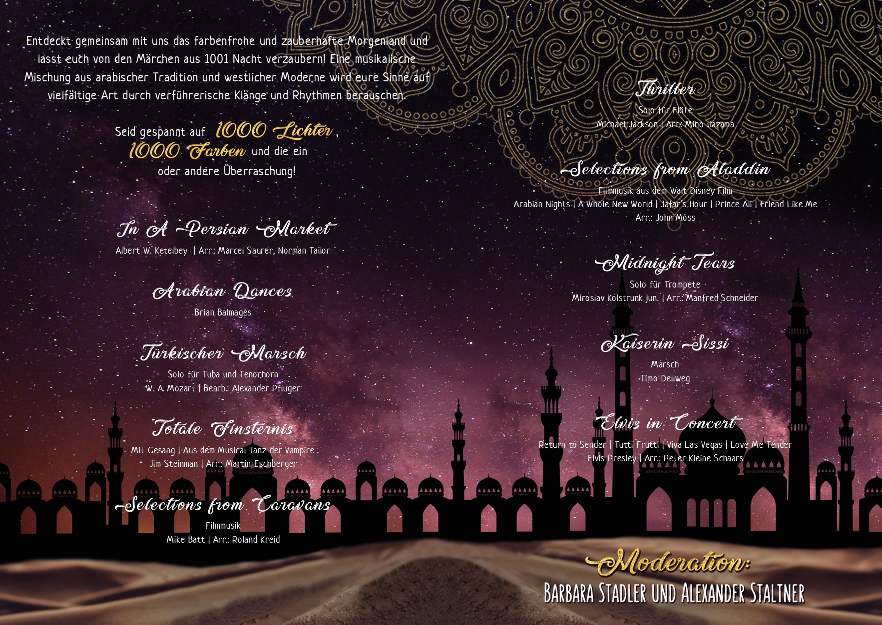 Aladdin bringt hoffentlich mit seiner Wunderlampe Licht in die totale Finsternis dieser einen Nacht. Trotz fliegendem Teppich hoffen wir, dass wir den Halt auf der Bühne nicht verlieren oder von den Zombies aus Jacksons „Thriller“ in die Unterwelt entführt werden. Eine musikalische Mischung aus arabischer Tradition und westlicher Moderne wird eure Sinne auf vielfältige Art durch verführerische Klänge und Rhythmen berauschen.