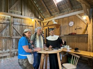 Nach dem Mittagessen fuhren wir weiter nach Sierning zu einem Bauernhof. Was wir dort zu tun hatten, sollte sich im Laufe des Nachmittags noch herausstellen. Zuerst wurden wir mit Kuchen und Kaffee sowie mit Most und Saft verwöhnt. Nach dieser Stärkung gab es ein spannendes Krimirätsel zu lösen: Im Ort wurde der Sauschädl gestohlen und wir, die gesamte Dorfgemeinschaft, wurde verdächtigt und sollte gleichzeitig mithelfen, den Dieb oder die Diebin zu finden. Bei lustigen und kniffligen Aufgabenstellungen wurden Hinweise gesammelt und Verdächtige befragt. Nach eingehender Aufklärungsarbeit wurden die Hauptverdächtigen einer Leibesvisitation unterzogen, wobei Sauborsten in der Hosentasche unseres Kapellmeisters Luki gefunden wurden. Schnell stellte sich heraus, dass auch Edith als seine Komplizin an dem Diebstahl beteiligt war. Nach einer Gerichtsverhandlung und einer reumütigen Entschuldigung wurde der Sauschädl den Bauersleuten zurückgegeben.