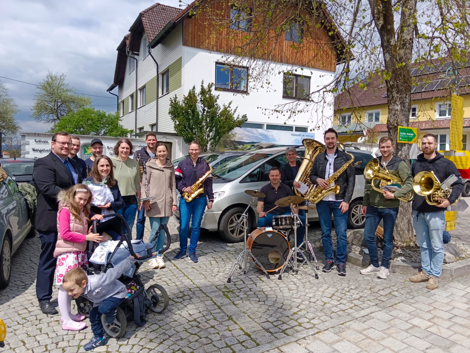 Am Sonntag, den 30. April, fand die Taufe von Lukas Stadler statt. Unsere Bierbrezn’ Musi empfing den Täufling und die Familie bei strahlendem Sonnenschein mit ein paar Märschen am Ortsplatz in Kleinzell. Nach Marie, David und Emilian ist seit Dezember auch Lukas Teil der Familie unserer ehemaligen Marketenderin Silke und unseres Trompeters Benedikt.
