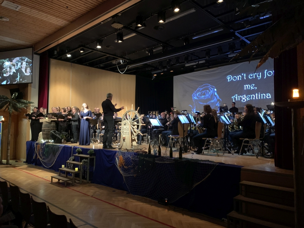 Beginnend im Jahr 1492 auf dem Schiff Santa Maria des weltberühmten Christoph Kolumbus eroberten wir mit Unterstützung des Chors Pfarrkirchen/Niederranna unter der Leitung von Irene Huber das Paradies am anderen Ende der Welt. Die Entdeckung Amerikas brachte jedoch nicht nur neue Möglichkeiten und viele Chancen für die Menschen damals, sondern auch unendliches Leid, Ausbeutung und zahlreiche unschuldige Tote. Diesen historischen Aspekt würdigten wir mit der Filmmusik aus dem Western “Die glorreichen Sieben”. Ein besonderes Highlight war auch für uns Musiker die Gesangseinlage von “unserer Evita” Hannah Hartl. Ihre zerbrechliche und gleichzeitig Mut vermittelnde Interpretation der Eva Perón im Stück “Don’t cry for me Argentina” bescherte uns bereits in den Proben den ein oder anderen Gänsehautmoment. Mit feurigen Rhythmen aus dem weltbekannten Disneyfilm “Pirates of the Caribbean – At World’s End” landeten wir endgültig in der wunderschönen Karibik und vermittelten den Zuhörern einen Ohrwurm, der viele noch bis nach Hause begleitet hat.