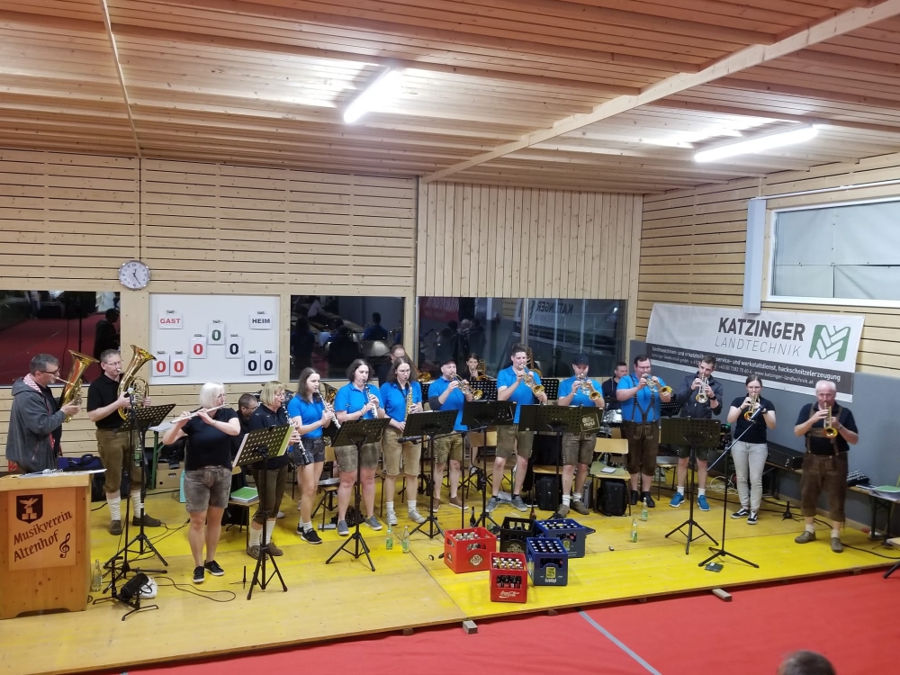 Bei der Eröffnung der neu renovierten Stockschützenhalle in Altenhof durfte unsere Bierbrezn’ Musi am 19. Mai 2023 für musikalische Unterhaltung sorgen. Abwechselnd mit den “Uns gfreids böhmisch” aus Hofkirchen wurden viele traditionelle Blasmusiknummer, aber auch ein paar modernere Stücke zum Besten gegeben. Als krönenden Abschluss spielten wir noch ein paar Stücke mit den Hofkirchnern gemeinsam. Wir gratulieren dem MV Altenhof zu dieser gelungenen Veranstaltung!